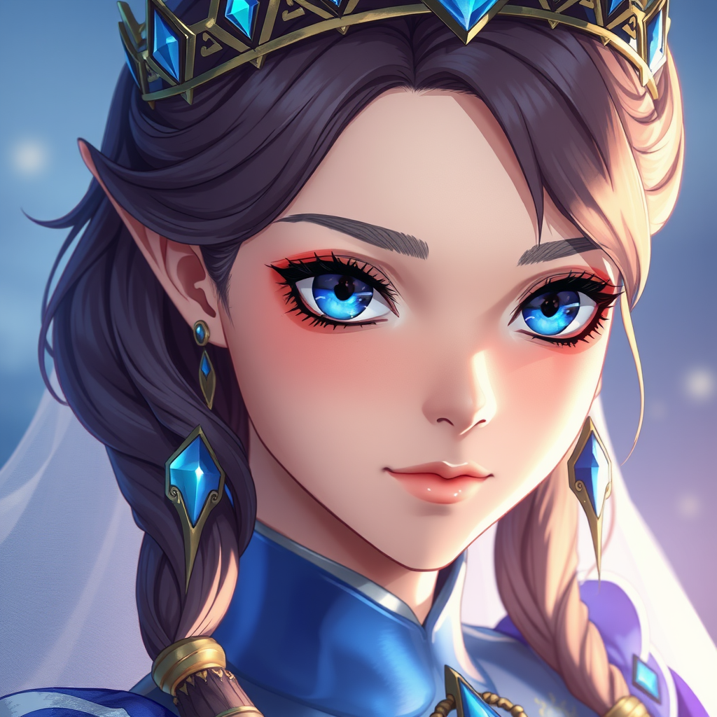 A stunning close-up portrait of a woman adorned in a shimmering sapphire dress, crowned elegantly, reminiscent of a celestial knight. A fusion of mystical anime aesthetics and the regal allure of a fantasy princess, she embodies a goddess-like aura. Her eyes, vibrant and depthful, echo legendary tales of heroism and courage, akin to a modern reimagining of a classic game icon. This piece, inspired by the "Breath of the Wild" art style, captivates with its meticulous detailing and ethereal charm, reflecting an exquisite blend of beauty and strength in a digital masterpiece.