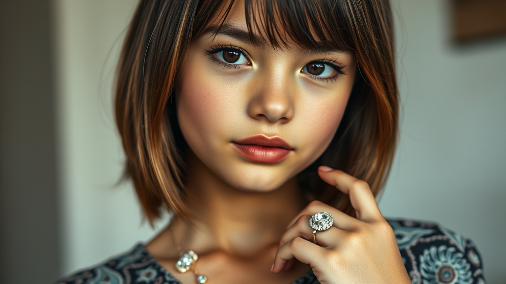 A stunning close-up portrait of a young, beautiful girl with flawless, natural skin. Her long, layered bob hairstyle frames her face elegantly. She has a slim figure with gentle curves. She wears an intricately patterned Persian Paisley blouse that complements her captivating presence. Beautiful diamond necklaces and rings adorn her, catching the subtle, soft lighting that enhances the highly detailed scene. Her expression is serene, exuding grace and confidence.