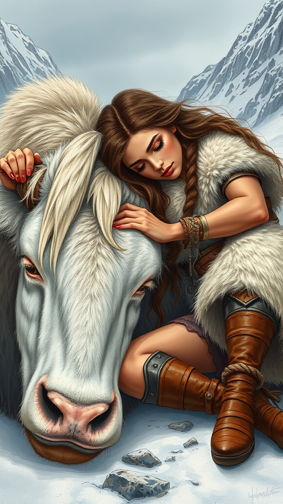 A stunning color sketch of a powerful and beautiful barbarian warrioress with intense brown eyes and long flowing sable hair, peacefully sleeping next to her majestic white war yak. Her skin is a warm tan, complemented by boots and armor crafted from rich brown leather and fur. The backdrop is a sketched scene of a snowy mountain path, with dynamic and volumetric lighting that enhances the atmosphere. This hyperrealistic and hyperdetailed piece captures the essence of dark romance fantasy, focusing on the beauty and strength of the characters amidst a breathtaking natural setting.