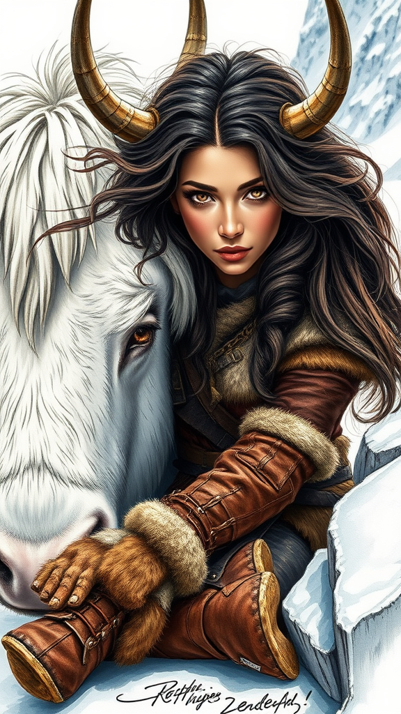 A stunning color sketch of a resilient and captivating barbarian warrioress with intense brown eyes and flowing dark brown sable tresses, resting peacefully beside her grand white war yak. Sun-kissed skin complements her attire of rugged brown leather and fur boots and armor. A snowy mountain ledge path forms the sketched backdrop. The scene is adorned with volumetric and dynamic lighting, creating a hyperrealistic and highly detailed maximalist masterpiece. The composition carefully balances elements of dark romance and fantasy, focusing on clarity and harmony while maintaining the essence of strength and beauty.