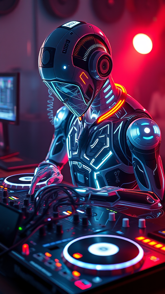 A stunning conceptual 3D render of a bioluminescent humanoid with artificial intelligence features, creatively engaged at an DJ console. This hyper-realistic scene is an exceptionally detailed digital painting, merging elements from ArtStation and concept art worlds. The artwork boasts an exquisite blend of smooth textures and sharp focus in an extraordinarily illustrated setting, designed with the cutting-edge capabilities of Unreal Engine 5. The scene achieves breathtaking photorealism, presented in HD quality at an 8k resolution. Utilizing Cinema 4D, the composition is enriched in 3D, offering a beautiful and cinematic atmosphere. The style is inspired by the artistic genius of Artgerm, Greg Rutkowski, and Alphonse Mucha, infusing the piece with a unique aesthetic flair.