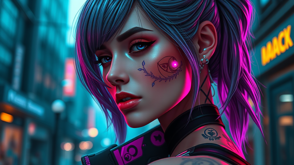 A stunning cyberpunk netrunner girl with intricate details inspired by Artgerm, WLOP, Ilya Kuvshinov, RHADS, Loish, and Rossdraws. She has a beautifully detailed face, captured with perfect shading and soft studio lighting. The imagery is ultra-realistic and photorealistic, rendered with octane technology. Bathed in cinematic lighting, the scene is in high dynamic range, 4k, and 8k resolution, featuring striking edge lighting. Her design includes subtle yet creative modifications, such as iridescent highlights in her sleek, futuristic attire and neon-infused tattoos that pulse gently with a luminescent glow against the urban backdrop. Her hair, a cascade of metallic hues, frames her face elegantly, adding to the surreal, otherworldly aesthetic.