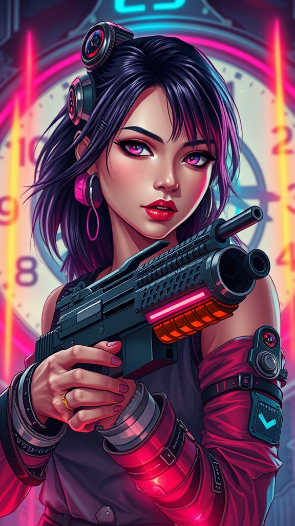 A stunning cyberpunk scene: a woman with a sleek gun, enveloped by a dynamic frame of futuristic clocks and neon lights. Her attire adorned with intricate cyberpunk gear, the setting is vibrant with lasers and glowing elements. In the style reminiscent of Cyberpunk 2077, the art captures a breathtaking science fiction atmosphere with high-definition, cinematic clarity. The portrait, detailed and colorful, embodies the anime aesthetic, featuring a sharp focus on facial features and expression. Background clocks emphasize the passage of time, enhancing the narrative. Despite the low resolution tags, the image maintains high quality with vibrant, chiaroscuro lighting and a striking composition. The portrayal is free from blemishes, presenting an engagingly complex and visually captivating character.