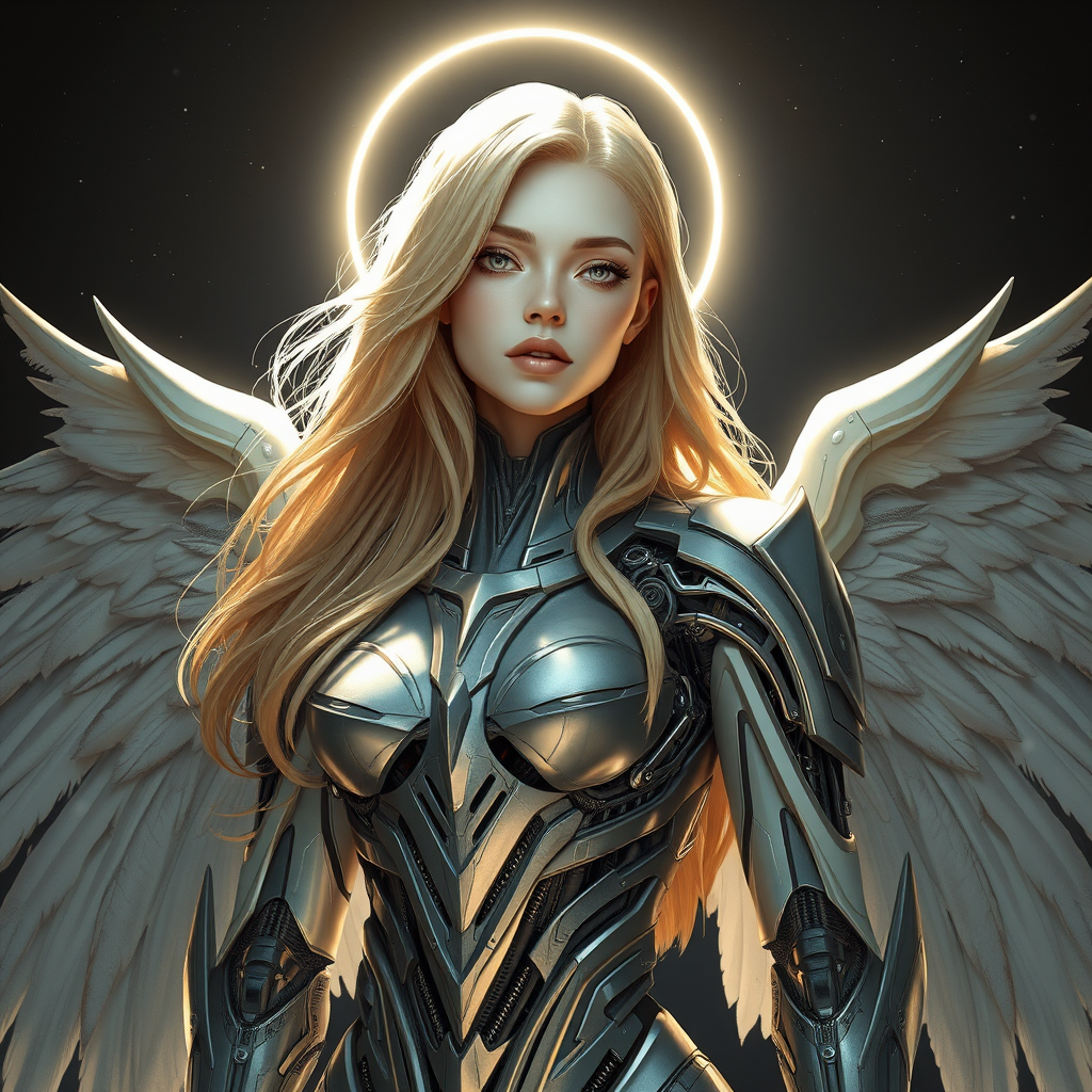 A stunning cyborg female angel stands amidst a halo of ethereal light, her features serene and emotionless. Her flowing, celestial blonde hair cascades like liquid gold around her shoulders, contrasting against intricately designed silver and white armor that glistens with a subtle iridescence. Her wings, mechanical yet graceful, emit a soft luminescence, enhancing her otherworldly appearance. Shadows dance across her form, highlighting the melancholic aura that surrounds her, while a dark, star-speckled background adds depth and mystery to the scene, emphasizing her serene isolation amidst the void.