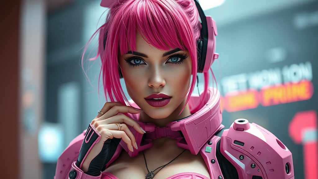 A stunning cyborg woman adorned in sleek pink combat armor and sporting vibrant pink hair embodies the essence of cyberpunk fashion. She exudes allure with hints of high-tech, sci-fi elements and wears a touch of futuristic lingerie. This captivating figure is posed in a manner that suggests a playful, flirtatious demeanor, her gaze fixed confidently on the viewer. Her portrait captures the essence of detail and realism, emphasizing her life-like skin texture. The image is framed in full-length, showcasing her elegance and poise, with a focus on high-resolution art quality. Utilizing diffused soft lighting and a shallow depth of field, the scene achieves a hyper-realistic, cinematic ambiance akin to CGI, without succumbing to low-resolution imperfections or compositional errors.