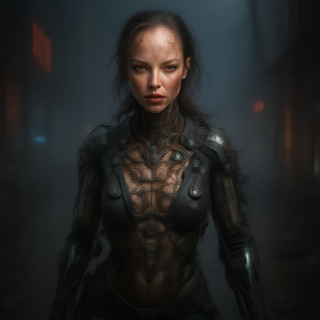 A stunning cyborg woman with weathered and slightly torn synthetic skin, corroded metal limbs, set in a cyberpunk universe, hyperrealistic, exceptionally detailed, 8k resolution, rendered in unreal engine, 3d visualization, portrait orientation 9:16, vibrant and evocative style with intricate textures, enhanced expression, detailed background elements.