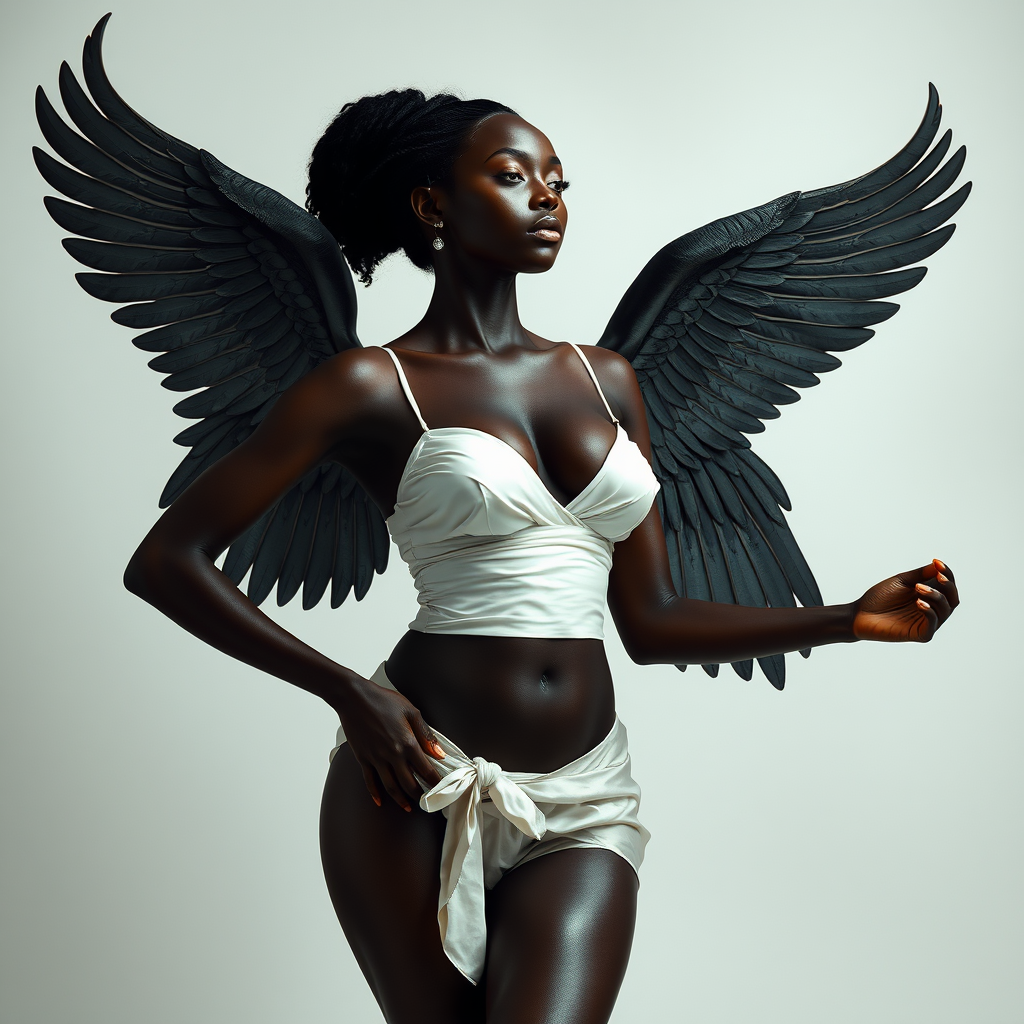 A stunning, dark-skinned goddess with an aura of pure elegance, she stands gracefully in a white top and silk panties, reminiscent of the ethereal beauty often captured by Roberto Ferri. Her skin shines with a deep, rich ebony hue, evoking the timeless allure of Rococo art. Inspired by the artistry of Nadine Ijewere, she embodies the essence of love and beauty, her presence both captivating and serene. Her pose, a harmonious blend of strength and grace, captures the essence of a muse born from a fusion of classical art and contemporary vision.