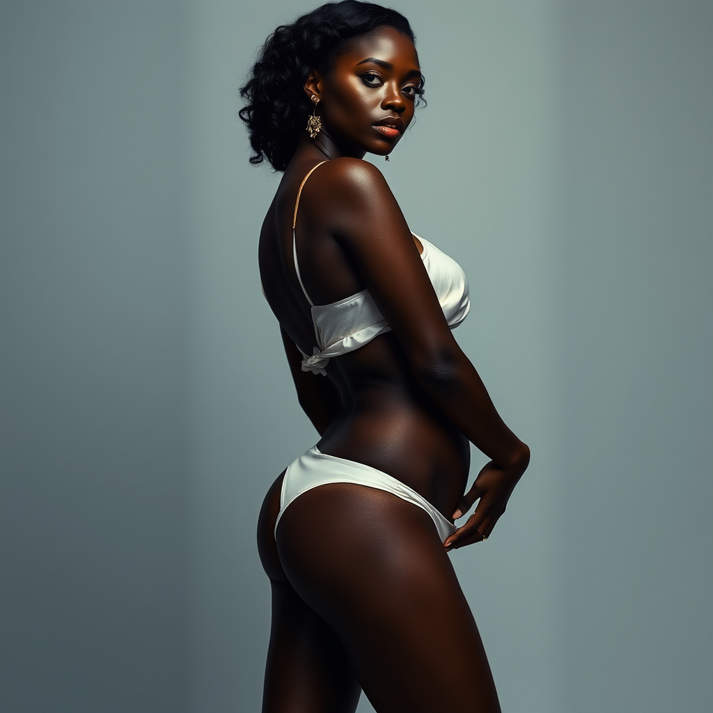 A stunning dark-skinned woman stands gracefully, wearing a delicate white silk top and matching panties, exuding an aura of divine beauty. Her striking features and radiant complexion evoke the image of a goddess of love, reminiscent of the ebony rococo style. This visual masterpiece draws inspiration from Roberto Ferri, capturing the ethereal and enchanting essence of his work. Her pose and expression reflect the artistic vision of Nadine Ijewere, celebrating the elegance and allure of dark skin in a modern, yet timeless fashion.