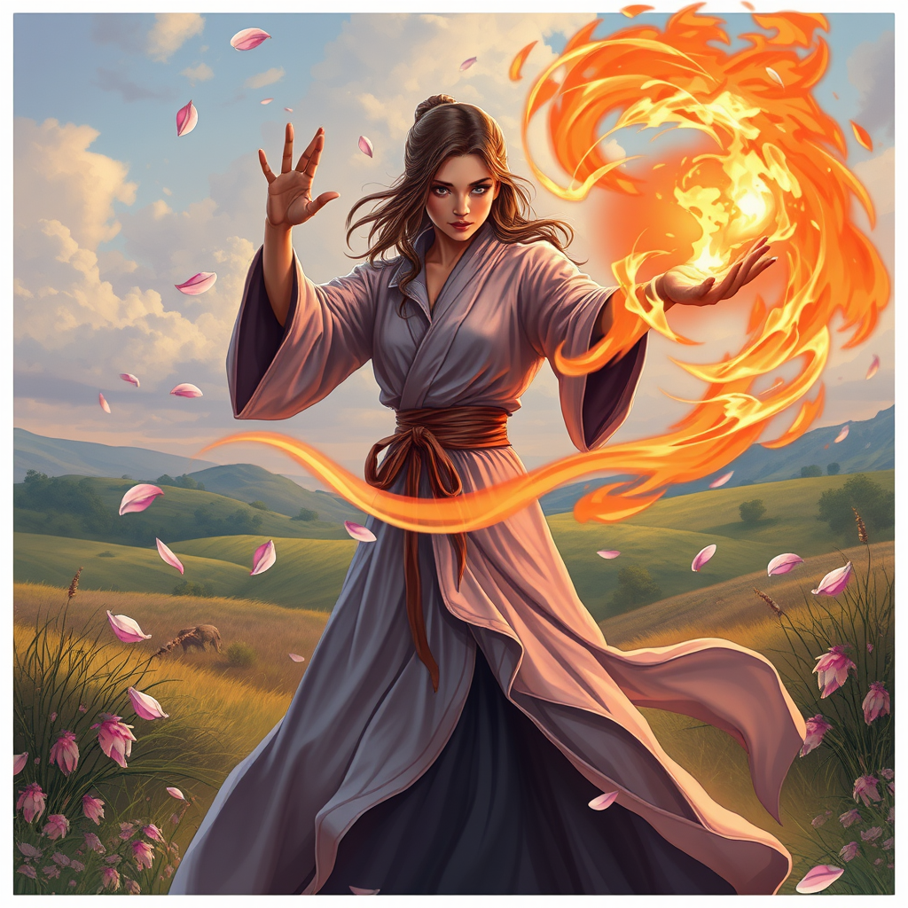 A stunning D&D character mage in a modelshoot style, depicted in a full body photo as if it's the most beautiful artwork in the world. The mage wears a flowing silk robe, commanding fire magic in an intricate, high-detail scene. Inspiration is drawn from the art styles of Ed Blinkey, Atey Ghailan, Jeremy Mann, Greg Manchess, and Antonio Moro. Set in a picturesque countryside, the mage strikes an action pose, casting a spell with swirling magic enveloping the canvas frame. The design is sharp and dramatic, echoing the artistic flair of Greg Rutkowski. Petals float around the scene, enhancing the enchanting atmosphere. The image is cartoonish yet photorealistic, emphasizing a smooth, balanced anatomy with hands gracefully poised, a natural neck length, and a focus on quality and detail. There are no deformities, mutations, or resolution issues, but instead, a celebration of beauty and magical prowess.