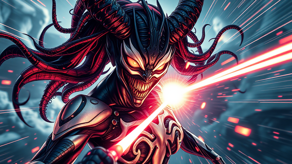 A stunning demon girl with a symbiotic design reminiscent of Tsutomu Nihei's style, featuring elements inspired by Venom from Marvel, rendered in a futuristic, sci-fi aesthetic. The scene is hyper-detailed with a laser beam striking from the sky, enveloped in energy clots creating a sense of acceleration and light flashes. The composition showcases incredible speed and motion, captured with ultra detail, particles, and fusion elements, maintaining symmetrical balance. The artwork is in 8k resolution, reminiscent of comic graphics with contour lighting, an intricate depth of field, and dramatic spotlighting. The perspective is first-person, presented in HD super-resolution and a vertical 1:2 aspect ratio, creating a dynamic, immersive visual.