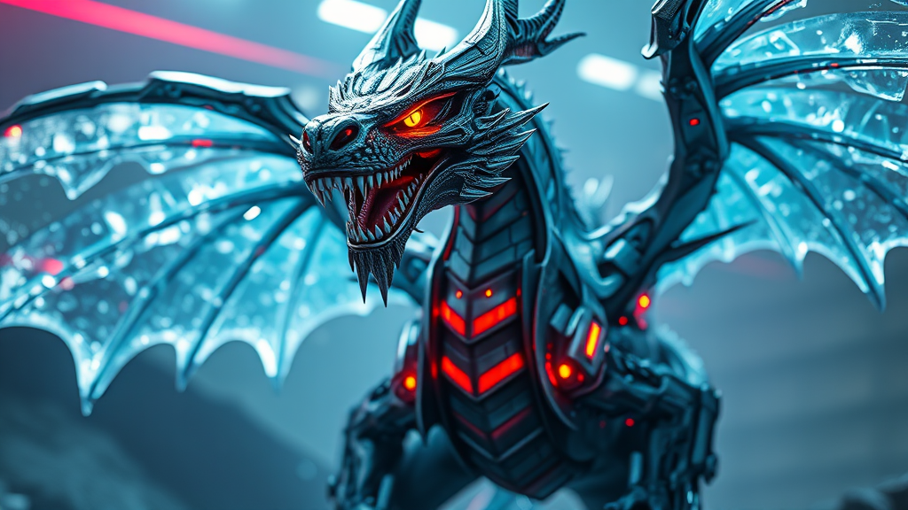 A stunning depiction of a futuristic metal dragon, showcasing intense fury eyes and a hyper-detailed, realistic design. The dragon is adorned with neon lights and exhibits an awe-inspiring blend of ice and metal effect wings. Captured in 4k super resolution, the full-body composition reveals a sci-fi environment, complete with laser accents that enhance the dragon's intricate features. The scene exudes a blend of realism and futurism, set against a backdrop that reinforces the dragon’s commanding presence in a world of advanced technology.