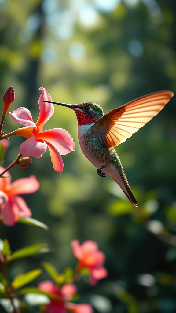 A stunning depiction of a hummingbird in flight, capturing its intricate beauty as it hovers near a vibrant blossom, the scene unfolding in a lush forest backdrop. Bathed in natural light, this photorealistic masterpiece showcases the bird in a dynamic pose in side profile. The image is rendered with hyper-realistic precision, every detail meticulously captured, evoking the sensation of observing wildlife photography at its finest, with unparalleled accuracy and clarity in ultra-high resolution, an artistic triumph with an aspect ratio of 5:7.