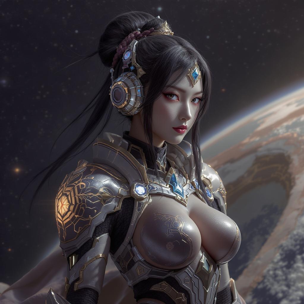 A stunning depiction of a Japanese female space warrior, showcasing intricate and elegant armor with detailed, ornamental designs inspired by fantasy themes. The image captures the essence of ometric art, drawing influences from the styles of Greg Rutkowski and Alphonse Mucha, with a harmonious blend of gradient lighting that enhances the overall atmosphere. The composition is a visual masterpiece in ultra-high resolution, highlighting the beauty and strength of the character, set against a backdrop that subtly suggests a cosmic exploration.
