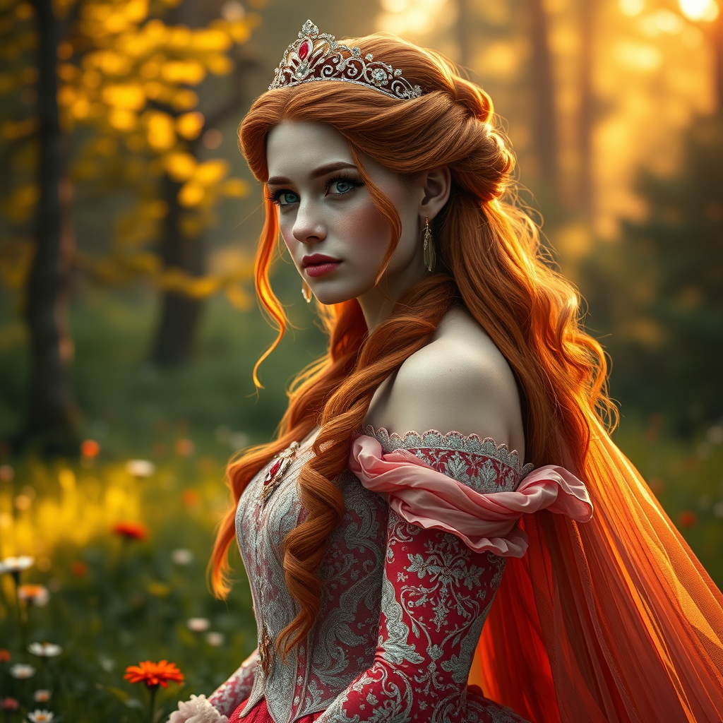A stunning depiction of a redheaded queen in a vibrant, elaborately detailed bridal gown, standing gracefully in a lush forest. Her flowing ginger hair cascades down to her waist, complementing her striking eyes and delicate freckles. She is adorned with exquisite jewelry, including a shimmering tiara and elegant earrings. The scene is bathed in warm, volumetric lighting that enhances the natural beauty of the surroundings, creating a cinematic and epic atmosphere. Flowers gently dot the landscape, adding bursts of color to the verdant field. The artwork captures hyper-detailed, refined features with an almost oil-painting texture, embracing the redshift style and film grain to enrich the illustration's depth. This breathtaking portrait embodies the powerful elegance and timeless grace of a queen, rendered with immense detail and clarity.