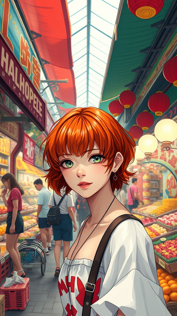 A stunning depiction of a vibrant marketplace scene featuring a striking red-haired girl with wavy short hair, exuding a sense of charm and individuality amidst the bustling array of colorful stalls and lively atmosphere, capturing the essence of the moment in a captivating and high-quality masterpiece.