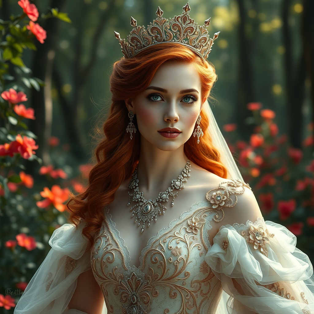 A stunning depiction of a woman with flawless red hair and captivating eyes, dressed in a beautifully intricate bridal gown fit for a queen. She stands confidently in a serene forest, surrounded by nature's vibrant flowers. Her elaborate outfit includes a crown and exquisite jewelry, enhancing her regal appearance. The scene is richly detailed with volumetric and cinematic lighting, capturing the essence of an epic portrait. Her striking features and the intricate design of the dress are rendered with oil painting techniques, adding depth and texture.
