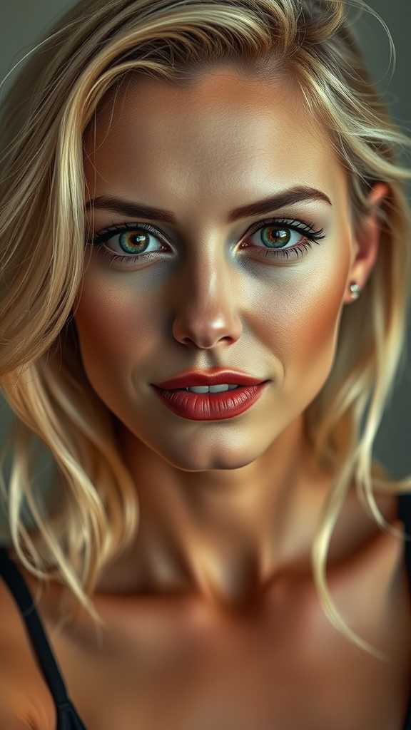 A stunning depiction of an ohwx woman, maintaining eye contact with the viewer, embodying the essence of a natural 40-year-old woman with a full body pose captured in Leica 50mm style. The image showcases exceptional quality and high resolution with beautiful lighting reminiscent of Hasselblad photography. Her skin possesses a realistic texture, embracing imperfections, highlighted by her blonde hair. The portrayal blends airbrushed 3D rendering and artistic painting influences evident in anime and manga illustrations. Subtle creative elements include unexpected anatomical quirks such as floating or disconnected limbs, adding a touch of surrealism. Big eyes and defined teeth enhance her character, along with a few tastefully placed piercings. Despite a cartoonish smoothness reminiscent of childhood or teenage portraits, the overall composition presents an exquisitely picture-perfect face, capturing both elegance and realness, while avoiding exaggerated features or unnecessary adornments.