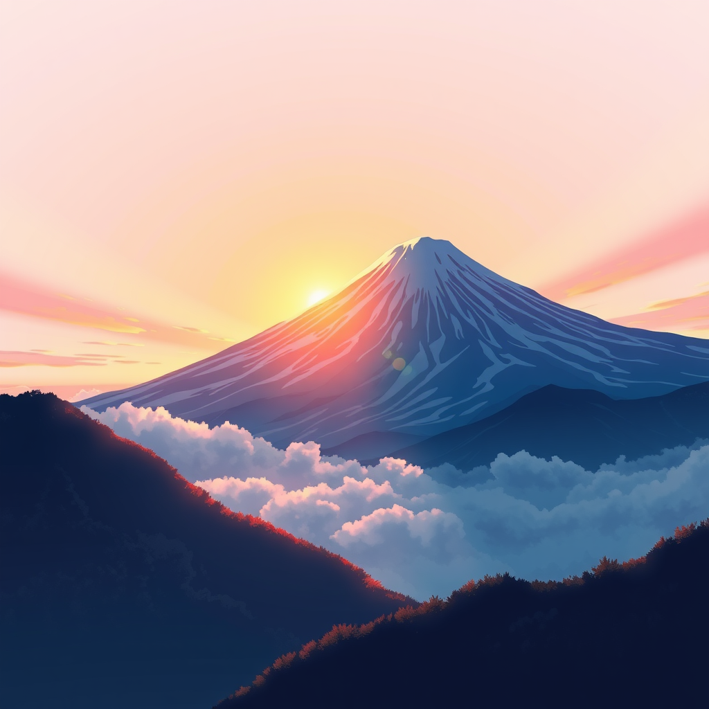A stunning depiction of Mt. Fuji illuminated by the breathtaking light of sunrise, reminiscent of the cinematic skies in Makoto Shinkai's "Your Name." The artwork showcases a blend of Studio Ghibli's whimsical charm and Artgerm's dynamic style, merged with Beeple's mastery of volumetric lighting. This masterpiece captures the ethereal beauty of a dawn bathed in vivid hues, perfect for a t-shirt design, rendered in a crisp vector format with bold contours against a pristine white background.