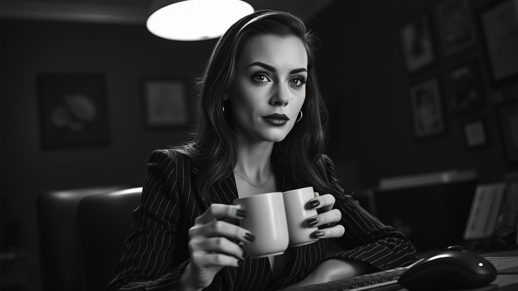 A stunning detective from the Noir 1940s era is captured in a high contrast black and white movie scene. This full-body shot highlights her slender frame as she sits confidently at a desk with a cup of hot coffee. Her long, shiny hair frames a face dusted with freckles, accentuating her symmetrical features. Her dark, reflective eyes, enhanced by subtle makeup, draw you into the scene. The room is filled with dramatic, rim lighting that casts intriguing shadows, illuminating dust particles in the air. She wears classic pinstripe trousers and is illuminated by a single ceiling lamp above, adding depth and atmosphere to the image. The shallow focus photography ensures the details of her surroundings, like a vintage keyboard and mouse, fade softly into the background.