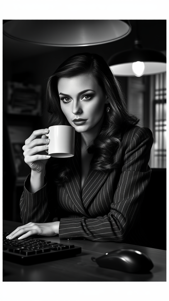 A stunning detective woman from the Noir 1940s era is perched at a desk, exuding elegance and mystery in a black and white setting reminiscent of classic film stock. High contrast lighting highlights her symmetrical face, adorned with subtle makeup and framed by long, shiny hair that cascades down her shoulders. Her dark, reflective eyes focus intensely, capturing the viewer's attention. Freckles add charm to her visage, as she sips a steaming cup of coffee. The scene is lit dramatically, with rim lighting accentuating her figure as dust particles subtly float in the background. She epitomizes the essence of a private investigator in her tailored pinstripe trousers, seated under a vintage ceiling lamp which casts intriguing shadows. The shallow depth of field and detailed lighting create an immersive setting, while the tactile presence of a keyboard and mouse on the desk hints at the mysteries she unravels. The artistry of the photograph captivates with its depth, detail, and timeless allure, seamlessly blending iconic elements of the genre.