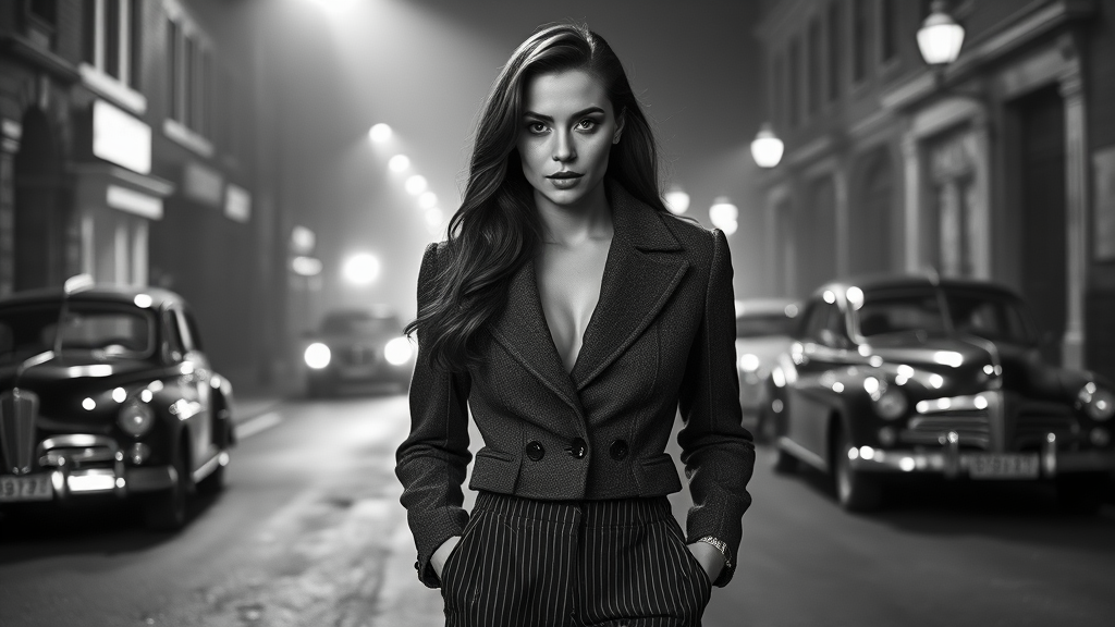 A stunning detective woman walks confidently down a 1940s street, embodying the elegance and mystery of a classic noir film. Her long, shiny hair cascades over her shoulders, while her striking dark eyes reflect the dim street lights. Freckles are subtly visible under her meticulously applied makeup, adding to her timeless beauty. She wears a sharp ensemble of pinstripe trousers paired with a tailored tweed jacket, showcasing her slender silhouette. The atmospheric scene is shrouded in mist and fog, with dust particles catching the detailed, dramatic lighting that creates a captivating play of shadows and highlights. This black and white film stock captures the essence of the era, drawing attention to the sophisticated depth of field and shallow focus that blurs the modern cars parked along the vintage street.