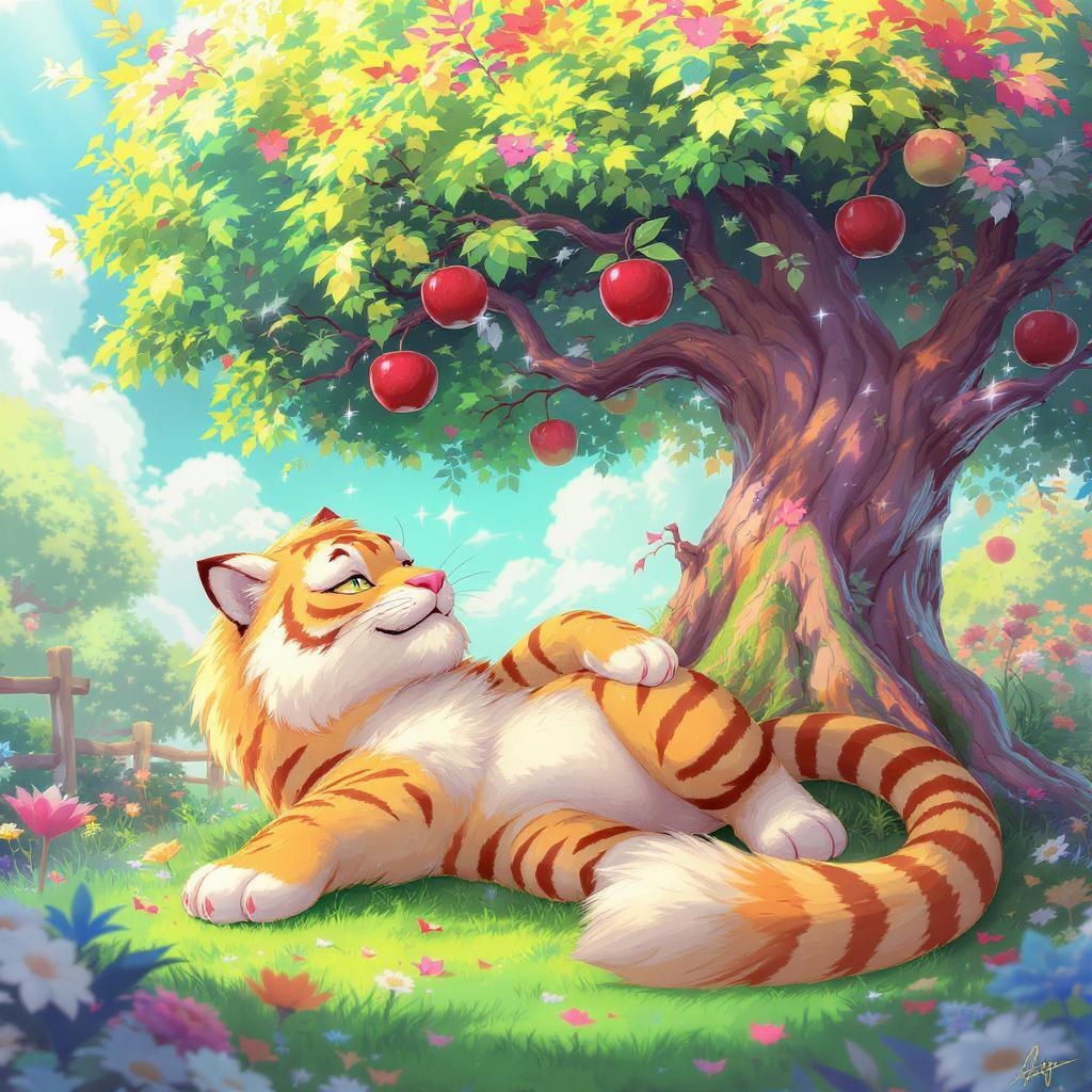 A stunning digital art depiction of a mythical tiger-like Pokémon lounging gracefully beneath a lush apple tree, rendered in a vibrant cartoon style. The scene is infused with elements of magic realism, featuring bright, enchanting colors that bring the setting to life. The composition showcases extensive attention to detail and hyper-quality resolution, capturing every intricate element with precision. The tiger Pokémon is meticulously detailed, its fur accentuated by the dappled sunlight filtering through the tree's leaves. The apples glisten with a magical sheen, hinting at their extraordinary nature. This artwork is designed to captivate viewers with its imaginative charm and high-resolution splendor.
