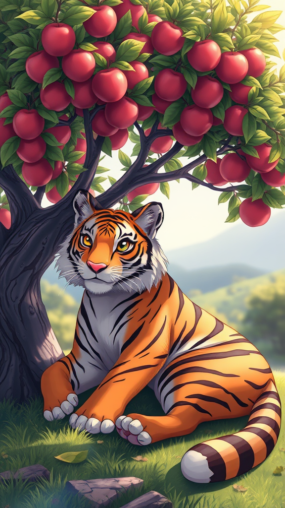 A stunning digital art of a majestic tiger Pokemon lounging under a lush apple tree, presented in a vibrant cartoon style with a touch of magic realism. The scene is bathed in bright, vivid colors, showcasing a hyper-quality and highly detailed setting. The composition is tall and elegant, capturing the essence of tranquility in a fantastical world. The tiger Pokemon's fur is a striking blend of orange and black stripes, shimmering in the sunlight filtering through the apple-laden branches. The backdrop features a dreamy landscape that hints at an enchanting realm beyond the scene, immersing the viewer in a high-resolution visual feast.