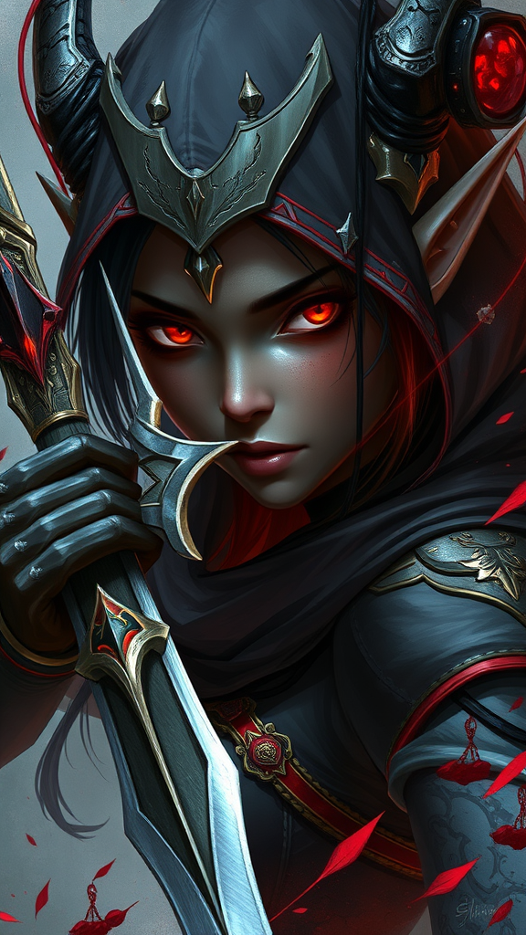 A stunning digital art piece depicting a female elf assassin with dark skin and mesmerizing red eyes. The illustration showcases intricate details and fantasy elements, inspired by artists Dan Mumford, Peter Mohrbacher, and Greg Rutkowski. The character exudes an aura of mystery and precision, with her attire and weapons elaborately designed. This vibrant illustration, rooted in a rich fantasy world, is rendered in high-resolution, capturing the essence of the elf's agility and stealth. The artwork embodies the style of trending works on platforms like ArtStation, presenting a visually captivating image that blends detailed beauty and dark fantasy. The assassin's poised stance and intense gaze reflect her formidable prowess, creating an unforgettable character portrait.