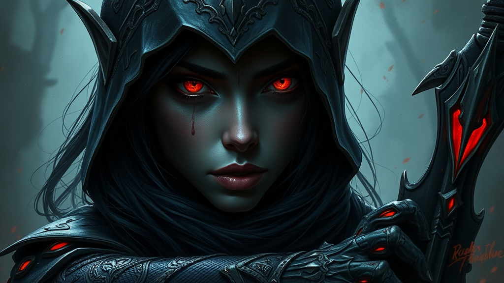 A stunning digital art portrayal of a female elf assassin with dark skin and mesmerizing red eyes, showcasing intricate details and vivid colors. The image captures the essence of fantasy and is inspired by artists like Dan Mumford, Peter Mohrbacher, and Greg Rutkowski. The artwork is a detailed illustration in high resolution, emphasizing the character's mysterious and stealthy nature. The scene is rich in texture, exhibiting a perfect blend of fantasy elements with a modern twist, trending on art platforms for its best quality and high-definition clarity. The character is depicted in a dynamic pose, surrounded by an atmospheric backdrop that enhances her enigmatic presence.