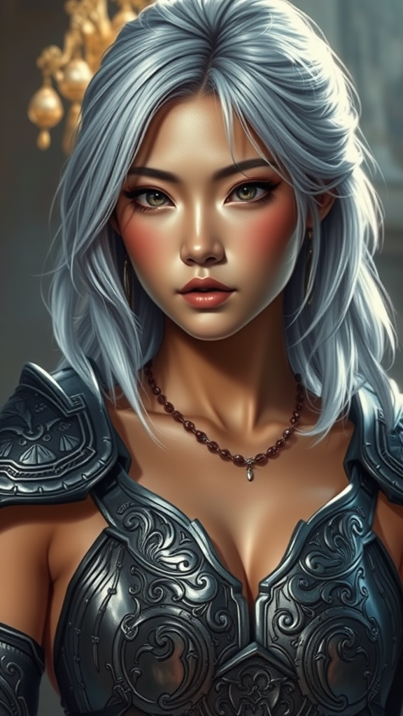A stunning digital painting featuring a breathtaking young Asian warrior woman with an exquisitely detailed and gorgeous face. Her full body is depicted with captivating beauty, showcasing her olive skin and medium-length silver hair that shimmers in the cinematic lighting. She wears intricately designed, elegant armor that is both revealing and protective, highlighting her strength and grace. The hyperrealistic style captures every nuance, with highly detailed illustration bringing the scene to life, complemented by masterful raytracing that enhances its depth and realism. It's a masterpiece of digital art that evokes awe and admiration.