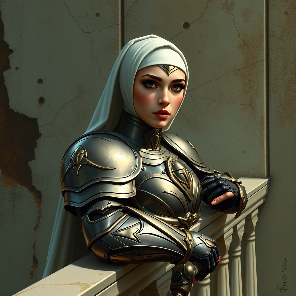 A stunning digital painting featuring the most beautiful woman in the world, a mesmerizing sister of battle leaning on a balcony railing. The scene captures her elegant poise, showcasing a detailed symmetrical face with reflective eyes, dark eyebrows, and flawless makeup. Her ornate, intricate armor reflects the unique style of Warhammer 40k, embodying the elegance of nun armor with rounded features. The background consists of ruined marble walls, marked with dust particles, bullet holes, and cracks, all brought to life with detailed, dramatic chiaroscuro lighting. The artwork draws inspiration from the professional, majestic impressionism of artists like Waterhouse, John Constable, and Jeremy Mann, and resonates with the enchanting magic of Studio Ghibli. A sense of intricate, high detail is evident throughout, making it a trending piece on ArtStation and CGSociety. The painting also features elements of face paint and headwear, set within an imagined world that fuses historical and fantastical aspects, captured in a grand, majestic oil painting style.