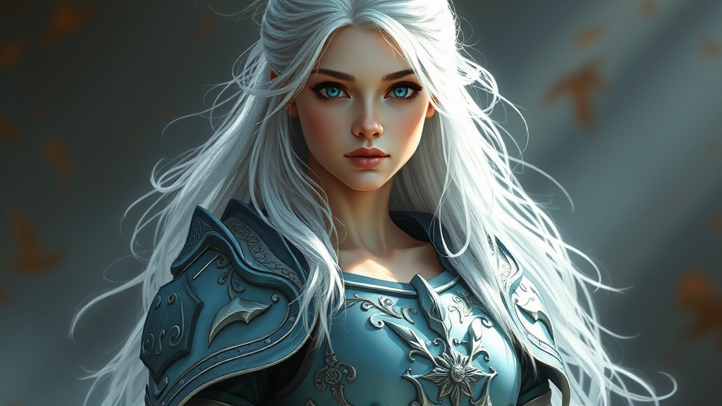 A stunning digital painting of a girl with a slender face and long, wild white hair cascading down her back. She is adorned in light azure armor, featuring intricate ornate details and a covered chest that gleams under the ambient light. Her pretty face is captured with perfect symmetry, exuding a sense of ethereal beauty. Inspired by the artistry of Artgerm, Greg Rutkowski, Magali Villeneuve, WLOP, and Ilya Kuvshinov, this concept art is rendered with sharp focus, using octane render to create a breathtaking photoreal quality. The scene is bathed in soft bloom and permeated with light rays and lumen, adding an enchanting glow to the composition. The girl's presence is both captivating and fierce, embodying the essence of fantasy and elegance in this masterfully illustrated piece.