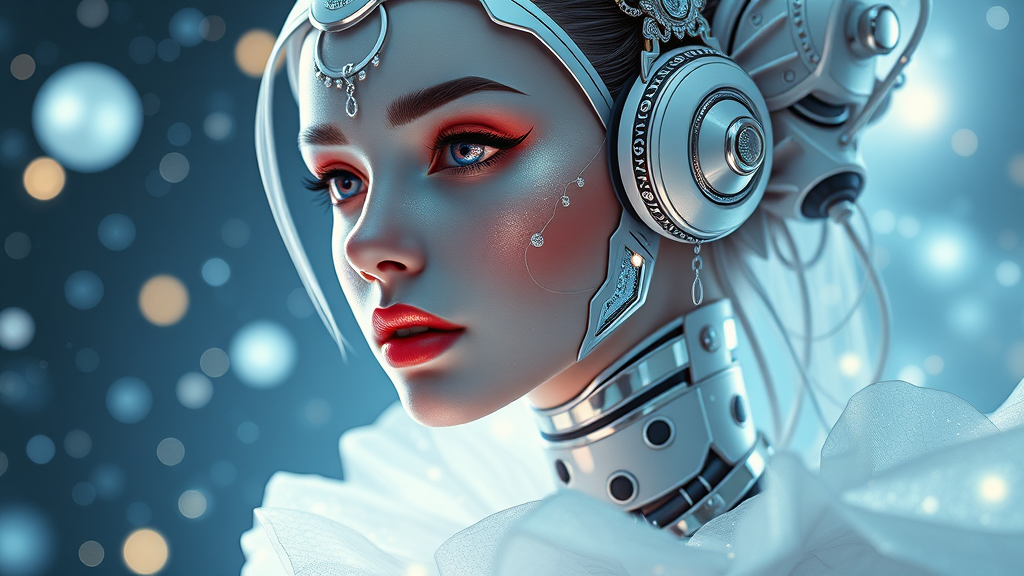A stunning digital painting of a shimmering white, opulent galactic ballerina with a touch of clowncore, this Russian cyborg college girl embodies the golden ratio. Set in a sci-fi and fantasy cyberpunk universe, the piece is intricately detailed and exudes a decadent charm. This 8k portrait showcases smooth and sharp focus, reminiscent of Ever After High and rendered in octane style. Inspired by concept art seen on ArtStation, the intricate illustration draws from the artistic styles of Artgerm, Loish, and Wlop, balancing elegance with otherworldly allure.