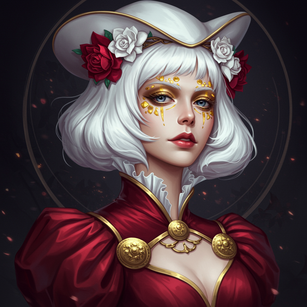 A stunning digital painting of a woman with white hair, dressed in a red gown and adorned with a white hat featuring gold details on her face. Styled in a manner inspired by Gaston Bussiere, Rutkowski, and Mucha, with hints of Tim Burton's whimsical elements and the intricate realism of Ivan Albright. The portrait draws on the atmospheric and award-winning lighting akin to a high-fashion magazine cover, with influences from artists like Michael Whelan and the surrealism of Rene Magritte. Delicate details such as a flower-crafted crown and golden ornaments adorning her neckline. Set against a dark fantasy background, the image captures a hyper-realistic, cinematic aura, rendered in an ultra-high-definition 4K format. This portrait reflects the grace and beauty found in WLOP's ethereal touch and Lisa Frank's vibrant, playful color palette, all while maintaining pristine photo-realism without distortions or flaws.