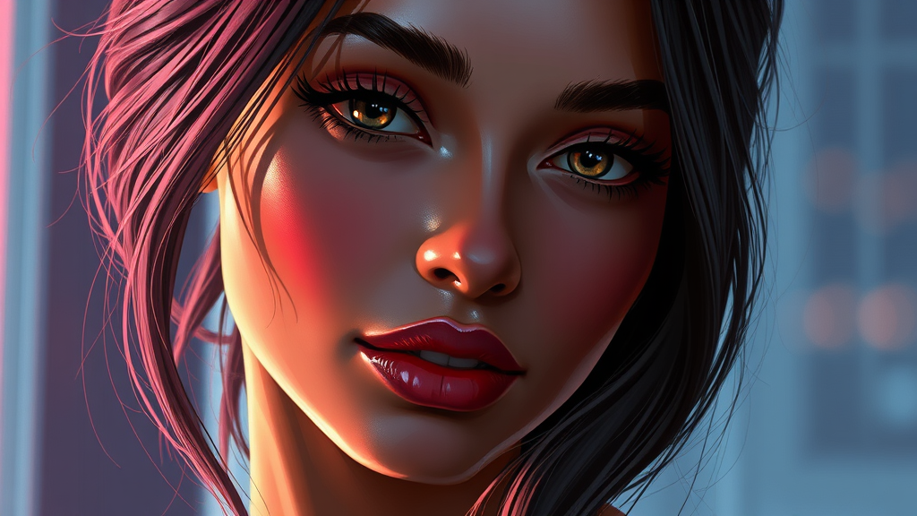 A stunning digital painting of Jasmine Tookes reimagined as an anime character in high resolution, embodying the hyper-detailed style of Yasutomo Oka and the ethereal beauty captured by Jovana Rikalo and Audrey Kawasaki. This artwork is a masterpiece of ultra quality, crafted with the intricacy of Josephine Wall and the luminous touch of Thomas Kinkaid. The scene presents a sophisticated woman with deep, iridescent eyes and perfectly smooth features, her expression relaxed yet captivating, exuding a subtle smirk. Her face is perfectly proportioned with sensual, deep red lips and detailed black pupils, framed by real hair that moves naturally. Bathed in realistic light and shadow, the composition echoes the striking visuals of Cyberpunk 2077 and Blade Runner. Her hair elegantly styled up, she embodies a mature, sexy allure, portraying a chic femme fatale. The image captures the essence of a vibrant cyberpunk world with a nod to the stylish elegance of The Fifth Element, focused sharply to highlight every exquisite detail of her expressive face and poised demeanor. This 8k wallpaper is an award-winning piece, offering a beautiful blend of realism and fantasy.