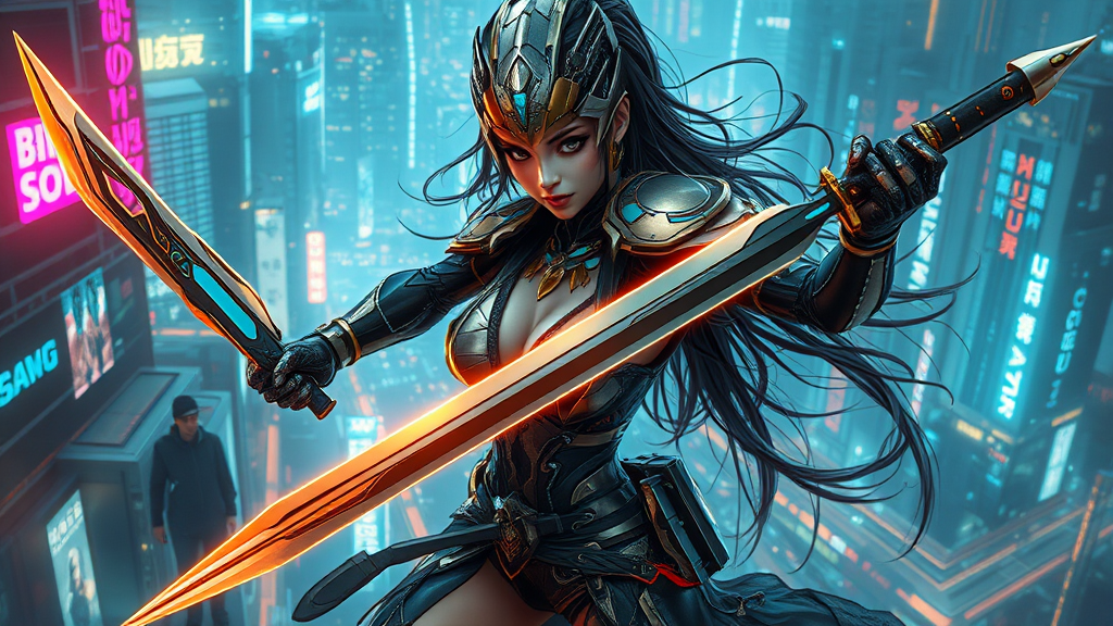 a stunning dmg female warrior wielding two gleaming swords in the style of robotic expressionism, adorned with an intricate blend of dark gold and dark cyan accents, surrounded by futuristic contraptions, inspired by the romantic landscapes of alois arnegger, captured from a high-angle perspective reminiscent of xu beihong's dynamic compositions, gracefully poised with an elegance echoing the essence of nusch éluard, amidst a backdrop of a futuristic cityscape bathed in the luminescence of neon lights