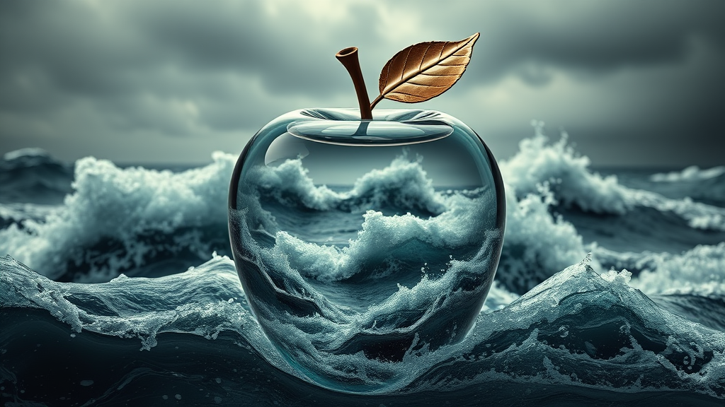 A stunning double exposure image blending a stormy sea with a glossy glass apple, where the tumultuous sea serves as the dynamic backdrop, its intricate details subtly intertwined within the lifeless glass apple. The composition features earthy tones of decadence, with the glass apple appearing hyper-realistic and extremely detailed. The image is shot in high definition using a dark softbox, employing cinematic raytracing techniques for photorealism and HDR qualities. A complex and captivating visual, the apple's sharp focus contrasts beautifully against the moody, storm-laden sea.