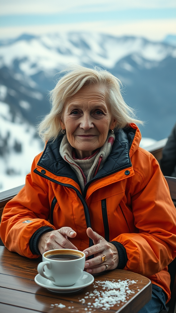 A stunning Dutch blonde woman in her 70s, seated at a mountain-top cafe, taking a break from skiing. She wears a vibrant orange ski jacket, with a steaming cup of coffee on the table before her. The scene is captured in a reportage style using a Nikon D850 and Kodak Portra 400 film with a f1.6 lens, conveying a hyperrealistic and textured yet intentionally low-resolution image. The composition is artistically flawed, displaying unusual anatomy with distorted and mutated features, missing fingers and extra digits. The image feels blurry and fuzzy, with misshaped, disfigured aspects that create a sense of being bizarrely intriguing yet unsettlingly strange.