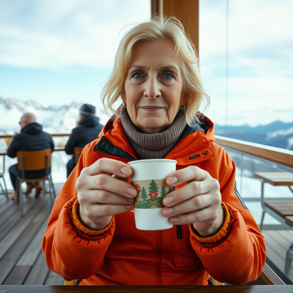 A stunning Dutch blonde woman in her 70s sits at a mountain top diner, enjoying a coffee during a break from skiing. She is wearing an orange ski jacket, and the scene captures her at eye level. The setting is depicted in a reportage style, as if shot with a Nikon D850 camera using Kodak Portra 400 film at f1.6 lens, creating a hyperrealistic texture in low resolution. The image features intentional visual quirks such as missing fingers, extra digits, and cropped composition, resulting in a portrayal with distorted anatomy, extra limbs, and poorly drawn hands. It embodies a sense of the surreal and abstract, emphasizing the aesthetic of being blurry, fuzzy, and misshaped, evoking a feeling of something intriguingly unattractive yet captivatingly unusual.