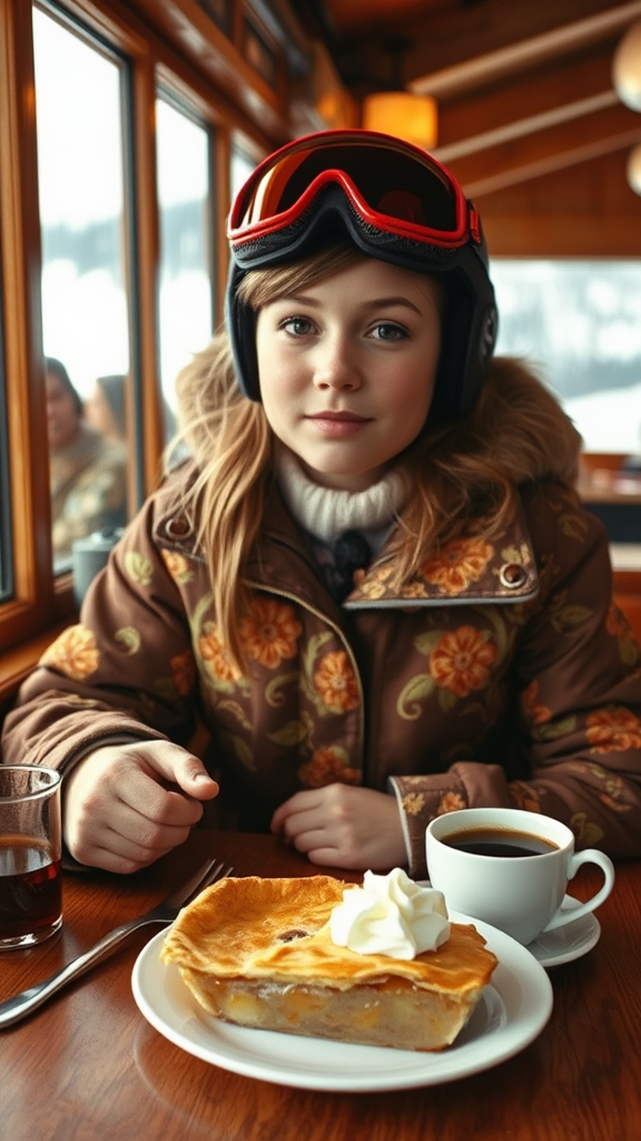 A stunning Dutch girl in a vintage 70’s mountaintop cafe, a steaming slice of apple pie with whipped cream and a cup of coffee on the wooden table beside her, taking a break from skiing. She is dressed in a retro brown and orange floral-patterned ski jacket, her cheeks rosy from the cold. The scene is captured in a candid reportage style, using a Canon camera loaded with Kodak film, with a telephoto lens to capture the ambiance of the moment, framed in a cozy vertical 4:6 aspect ratio. The warm, nostalgic feel of the image draws you into a bygone era of winter adventure.