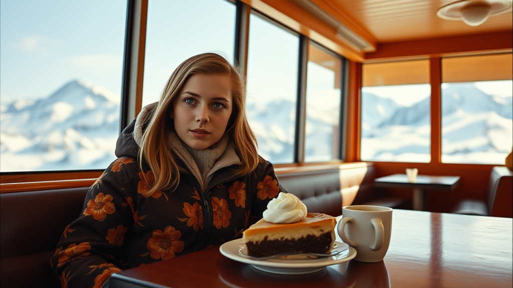 A stunning Dutch girl sits in a 1970s mountain top diner, her eyes reflecting the snowy peaks outside. On the table before her, a steaming slice of pie topped with a dollop of cream and a fresh cup of coffee create a cozy scene. She's on a break from skiing, dressed in a retro brown and orange floral ski jacket that speaks to the era. Captured in a reportage style with a Canon camera using Kodak film, the telephoto lens frames her in an intimate portrait against the panoramic alpine view. The atmosphere is warm, filled with the nostalgic charm of a bygone decade.