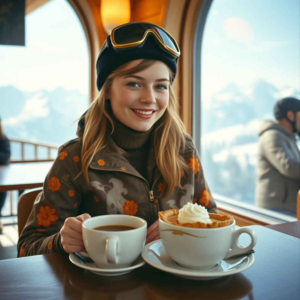 A stunning Dutch girl sits in a quaint, retro mountaintop diner from the 70s, with a vintage vibe enriched by wooden interiors and large panoramic windows. In front of her, a steaming slice of apple pie adorned with a dollop of cream rests beside a freshly poured cup of coffee, their aromas mingling beautifully. She's on a break from an exhilarating morning of skiing, wearing a chic brown and orange floral-patterned ski jacket that captures the essence of the era. The scene is captured in an authentic reportage style using a Canon loaded with Kodak film, featuring a dreamy telephoto lens effect that softly blurs the bustling backdrop of fellow skiers and the majestic snowy peaks beyond. Her relaxed demeanor and subtle smile reflect a moment of pure bliss amidst the winter wonderland.