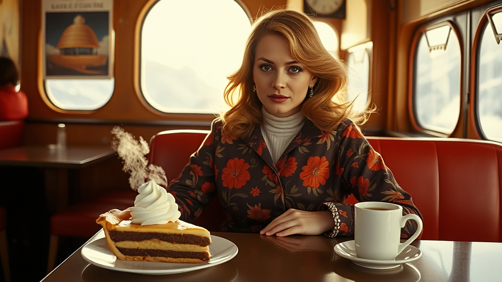 A stunning Dutch woman, radiating 70s charm, sits elegantly in a vintage mountain-top diner, bathed in the soft afternoon light. In front of her, a steaming slice of pie topped with rich cream and a freshly brewed coffee beckon invitingly. She's on a momentary escape from the snowy slopes, clad in a retro brown and orange floral ski jacket that pays homage to the era. Captured in vivid detail, this reportage shot highlights her serene expression and the nostalgic ambiance. The scene is brought to life through the lens of a trusty Canon, immortalized on the warm hues of Kodak film with the subtle compression of a telephoto perspective.