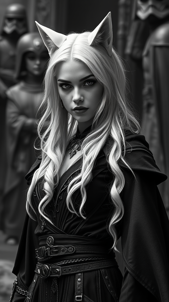 A stunning, enigmatic female Sith lord exudes power and grace, her striking white hair cascading over her shoulders. Adorned with subtle cat ears, her beautiful, hyperdetailed face commands attention. She stands in a dynamic pose within an immersive, grayscale world, the monochrome tones highlighting her formidable presence. The detailed background adds depth while emphasizing her dominance. Perfectly captured in 8k resolution, the scene is a masterpiece of artistry, with a precise depth of field that brings her into sharp focus. Her intricate clothing and accessories evoke the dark elegance of her Sith heritage. abordagemnegative, depthenhance, ultracrisp, expertlycrafted, divinebeautyeffect, noflaws, perfectedcomposition, masterylightingshadow, cinematicdrama, backgroundsublime, depthsensational, captivatingvisuals.