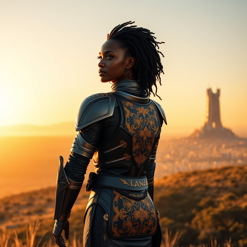 A stunning Eritrean woman stands confidently on a hill in the 24th century, gazing over the breathtaking Serengeti Plains. She is a space captain, recently returned from a seven-year mission patrolling the Milky Way's spiral arm. Her full battle dress is crafted from Vibranium armor, elegantly adorned with a striking black and gold kente cloth pattern. The golden hour casts a warm glow across her, accentuating her fit and attractive features. In the background, a city reminiscent of Wakanda and Black Panther rises majestically, marking her homecoming. This scene captures the epic and intimate emotions of a warrior's return, blending realism and Afro-futurism in a style that recalls films like Interstellar and the visionary direction of Ava DuVernay.