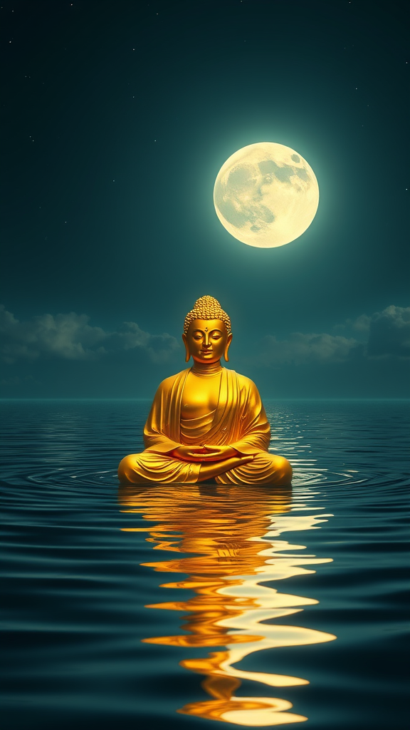 A stunning ethereal scene of a luminous golden Buddha serenely sitting in tranquil waters, with a radiant full moon suspended in the night sky. Crafted in the style of captivating optical illusions, reminiscent of sketchfab, in ultra-high definition. The reflection of the moon dances softly on the rippling surface, creating a surreal atmosphere. The cool night air is palpable, as celestial stars twinkle subtly in the vast expanse. The Buddha's peaceful expression exudes tranquility and timeless grace, casting a serene glow across the landscape.