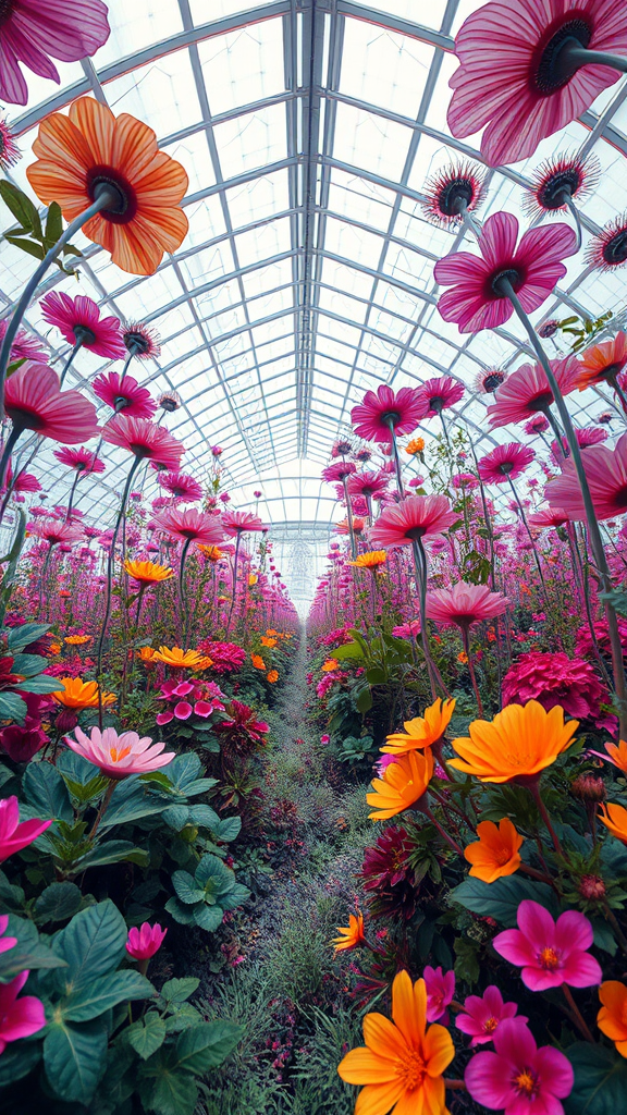 A stunning eye-level view photograph captures a massive futuristic greenhouse filled with bizarre and enchanting flowers, designed through an incredible collaboration of cyberpunk artistry. The scene is bathed in triadic color grading, offering a vibrant and harmonious blend of colors, with detailed drop shadows adding depth. The hyper-realistic photography reflects an intricate masterpiece quality akin to the style of Tom Bagshaw, featuring a rich cyberpunk background with 32k UHD clarity. The composition’s exquisite detail and realistic textures emphasize a unique vision of the future, where nature meets advanced technology in a breathtaking display of creativity and innovation.