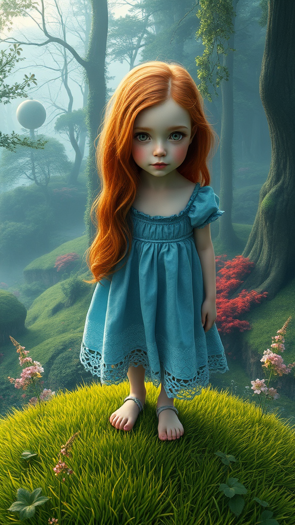 A stunning fantasy landscape featuring a blend of a mystical forest and elements inspired by Dante's inferno, with an enchanting Nordic red-haired young girl at its center. She stands atop a verdant hill, exuding charm in her flowing blue lace dress, her delicate feet poised gracefully on the lush grass. Her face is strikingly symmetric, with hazel eyes possessing a mesmerizing circular iris, captured in a hyper-realistic and cinematic manner. The vivid scene is presented with ultra-sharp focus, combining the detail of a 3D render with the aesthetic touch of renowned artists like Mucha, Klimt, and Erte. The artwork is vibrant and intricately detailed, providing a sense of both serene beauty and an underlying ominous tone. The piece is an artistic masterpiece, echoing the styles of Giger and Beksinski, and rendered in ultra-high definition. This breathtaking visual is a testament to the skills of artists like Artgerm and Tanvir Tamim, and would surely be a standout piece on platforms like ArtStation and Behance.