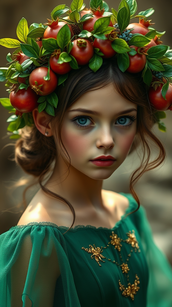 A stunning fashion cover depicts a full-body image of a mesmerizing girl with enchanting dark eyes, donned in an elegant emerald dress. Her head is adorned with an elaborate crown made of intertwined pomegranates and lush greenery, adding a whimsical yet regal touch to her captivating presence. Subtle hints of gold embellishments on the dress catch the light, enhancing the overall ethereal quality of the scene.