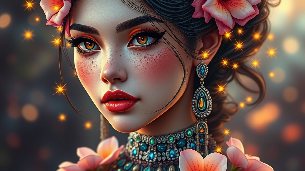 A stunning fashion-inspired Javanese girl adorned with exquisite jewelry, a freckled woman with hair resembling glowing fireflies, dressed in flowers. The artwork reflects the style of Artgerm, WLOP, and Ilya Kuvshinov, gaining popularity on ArtStation. The digital piece channels the elegance of Chanel and Dior, with influences from artists like Daniel F Gerhartz, Akihiko Yoshida, Anna Dittmann, Tetsuya Nomura, and Tom Bagshaw. The illustration is vibrant with colorful ink, showcasing symmetrical facial features and precise anatomy under soft and warm lighting. The artwork is hyper-detailed with sharp focus, intricate elements, and a beautiful Bokeh effect. Rendered in UHD, HDR10, and 16K for an Absurdres finish, the image avoids issues like duplication, distortion, or mutations, presenting a seamless and high-res visual experience without any distractions from watermarks or artifacts, drawing the viewer into its enchanting yet realistic portrayal.